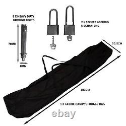 Alongside this, the frame benefits from an anchorage system which can be fitted using the heavy duty ground bolts. Excellent Ventilation####x200B;####x200B;####x200B;####x200B;####x200B;####x200B;####x200B. Mesh ventilation windows either side of the tent allow excess heat to escape, preventing condensation as your engine cools. The black flaps disguise the vents to aid the sleek design and can either be velcroed shut or rolled up to maximise air flow. ####x2714;####x200B;####x200B;####x200B;####x200B;####x200B;####x200B;####x200B. Frame Material: Black Powder Coated Steel. Protection: UV & Rot Protection. ####x2714;####x200B;####x200B;####x200B;####x200B;####x200B;####x200B;####x200B; ####x200B;####x200B;####x200B;####x200B;####x200B;####x200B;####x200B. Tent Height: 155cm / 1.55m / 61####x201D. Tent Width: 105.6cm / 1.056m / 41.6####x201D. Tent Depth: 270cm / 2.7m / 106.3####x201D. Developed with ultimate security and protection in mind, this folding bike tent is a must for any motorcycle owner! Constructed with a steel framework to offer incredible strength and durability, keeping your bike safe, clean, and dry so it's always ready to ride. Constructed with a######xA0;steel framework to offer incredible strength and durability, keeping######xA0;your bike safe, clean, and dry so it####x2019;s always ready to ride.
