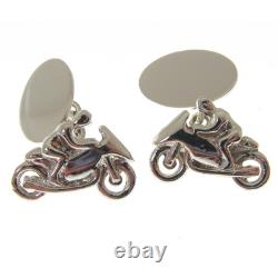 A PAIR OF TOP QUALITY ENGLISH MADE STERLING SILVER CUFFLINKS WITH A RACING MOTORBIKE THEME. THE MOTOR CYCLE IS LIKE THE ONES USED ON THE ISLE OF MAN IN THE TT RACES. THE SILVER CUFFLINKS HAVE BEEN MANUFACTURED IN OUR OWN WORKSHOPS THAT ARE LOCATED IN BIRMINGHAM'S FAMOUS JEWELLERY QUARTER AND HAVE BEEN FULLY TESTED AND HALLMARKED AT THE BIRMINGHAM ASSAY OFFICE. SIZE OF EACH OVAL = 18mm x 12mm.