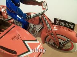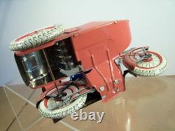 This one is in superb, original condition. The motorcycle and sidecar are in mint condition. There are some surface scratches to the rider. I would rate it at 9.9/10.It is a free running toy (no motor). Overall a superb old toy in superb, original condition!! Will look great in any collection!
