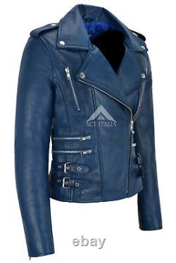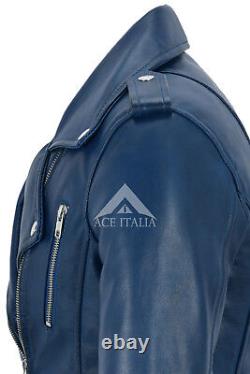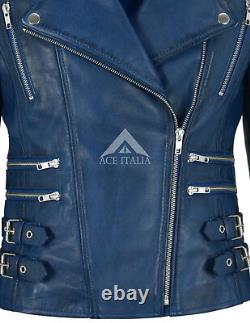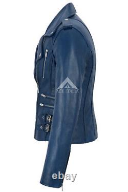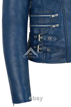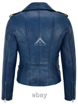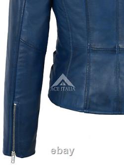 Veste en cuir véritable pour femmes, design mode en cuir Napa bleu, style moto biker 7113. Fabriquée en véritable cuir d'agneau souple. Une veste de très bonne qualité qui s'adaptera parfaitement à toute femme. Le cuir véritable vieillit magnifiquement avec le temps.